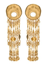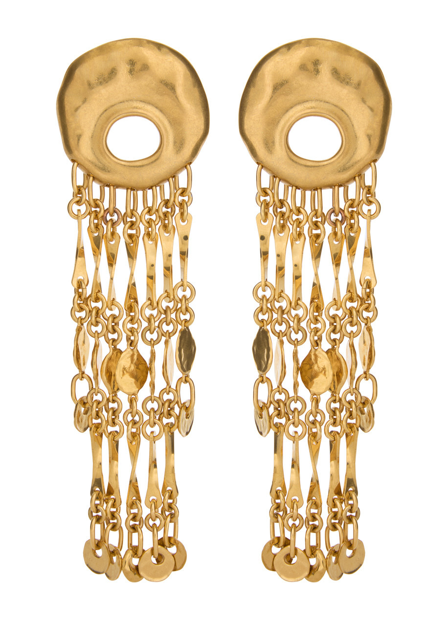 Info & Care Chloe metal earrings Sculpted design, hanging chain details with hammered pendants, designer engraved Clip-on fastening for non-pierced ears Presented in a designer stamped box Size & Fit Width: 3.5cm Drop: 12cm
