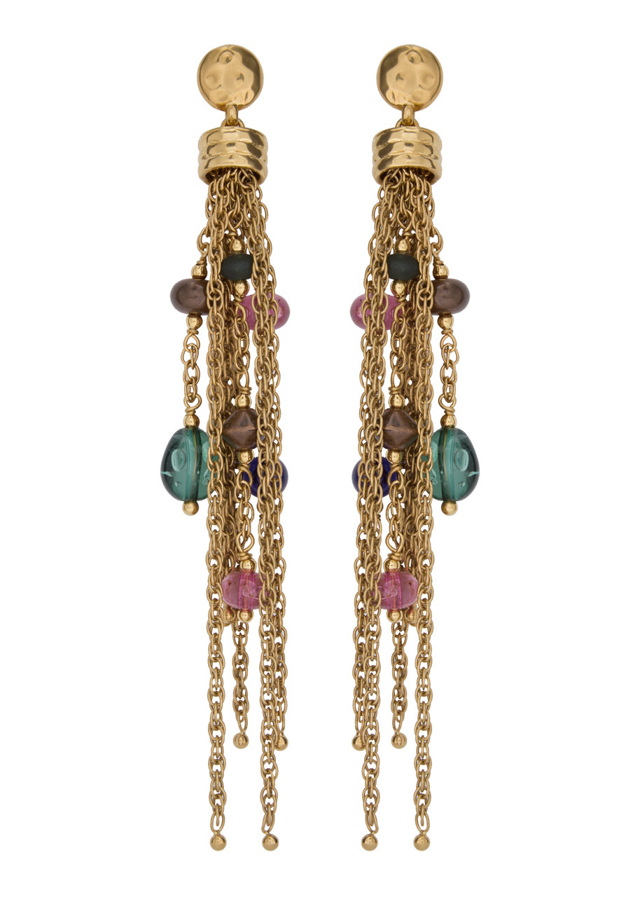 Info & Care Chloe metal drop earrings Layered chain detail, faux pearl and crystal embellishments, designer-engraved; Post-fastening for pierced ears Presented in a designer-stamped box Please note, we are unable to refund or exchange pierced earrings Size & Fit Drop: 14cm