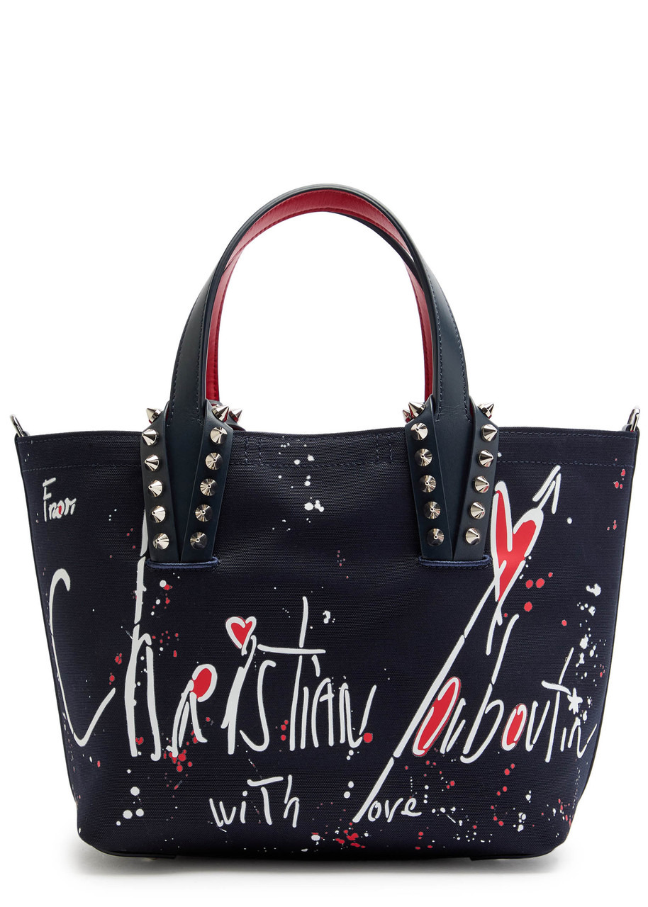 Info & Care Christian Louboutin;canvas;tote; Two top handles, detachable adjustable;leather shoulder strap, spike embellishments, designer printed front, feet, internal patch pocket, signature;red lining Magnetic press-stud;fastening at top; Size & Fit Width: 9 inches/ 23cm Height: 8 inches/ 20.5cm Depth: 5.5 inches/ 10cm Top handle drop: 5 inches/ 14cm Min. shoulder strap drop: 18 inches/ 46cm Max. shoulder strap drop: 21 inches/ 53.5cm
