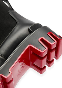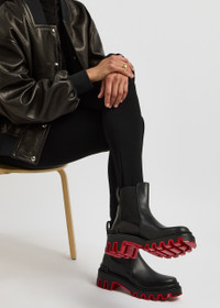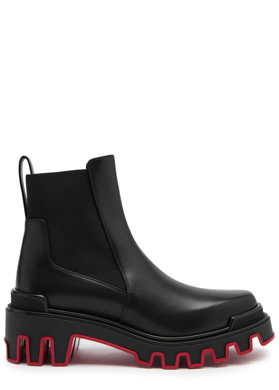 Info & Care Christian Louboutin leather chelsea boots Chunky sole measures approximately 2 inches/ 50mm Elasticated inserts at sides, heel tab, textured heel strip. signature red sole, gripped rubber sole, round toe Pull on Please note, we ask that all Christian Louboutin shoes be tried on carpeted flooring. Damage to the signature red sole may make them unsuitable to return. The red lacquer of the soles will wear with use. This is not a manufacturing error and is a result of normal wear and tear. Please consult a specialist in leather care for specific advice. We recommend keeping the leather clean and dry using a soft cloth and always protect from rain and moisture. Avoid contact with abrasive surfaces. Always store away from direct light and heat and in the dust bags provided.