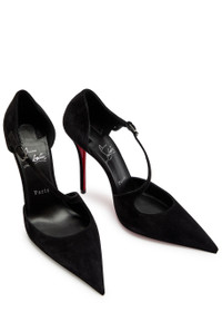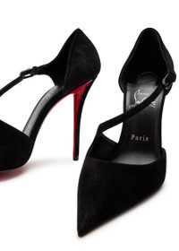 Info & Care Christian Louboutin suede pumps Heel measures approximately 4 inches/ 100mm; Signature red sole, pointed toe Buckle-fastening ankle strap Please note; we ask that all Christian Louboutin shoes be tried on carpeted flooring. Damage to the signature red sole may make them unsuitable to return. The red lacquer of the soles will wear with use. This is not a manufacturing error and is a result of normal wear and tear. Please consult a specialist in leather care for specific advice. We recommend keeping the leather clean and dry using a soft cloth and always protect from rain and moisture. Avoid contact with abrasive surfaces. Always store away from direct light and heat and in the dust bags provided. Size & Fit Narrow across the toe Only available in full sizes, go up to the nearest whole size if you take a half size