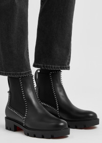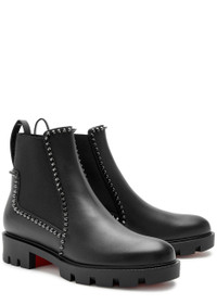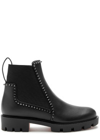 Info & Care Christian Louboutin leather ankle boots; Chunky sole measures approximately 1.5 inches/ 40mm; Elasticated inserts at sides, heel tab, spike embellished trims, signature sole, gripped rubber sole, round toe; Pull on; Please note; we ask that all Christian Louboutin shoes be tried on carpeted flooring. Damage to the signature red sole may make them unsuitable to return.; The red lacquer of the soles will wear with use. This is not a manufacturing error and is a result of normal wear and tear. Please consult a specialist in leather care for specific advice. We recommend keeping the leather clean and dry using a soft cloth and always protect from rain and moisture. Avoid contact with abrasive surfaces. Always store away from direct light and heat and in the dust bags provided.
