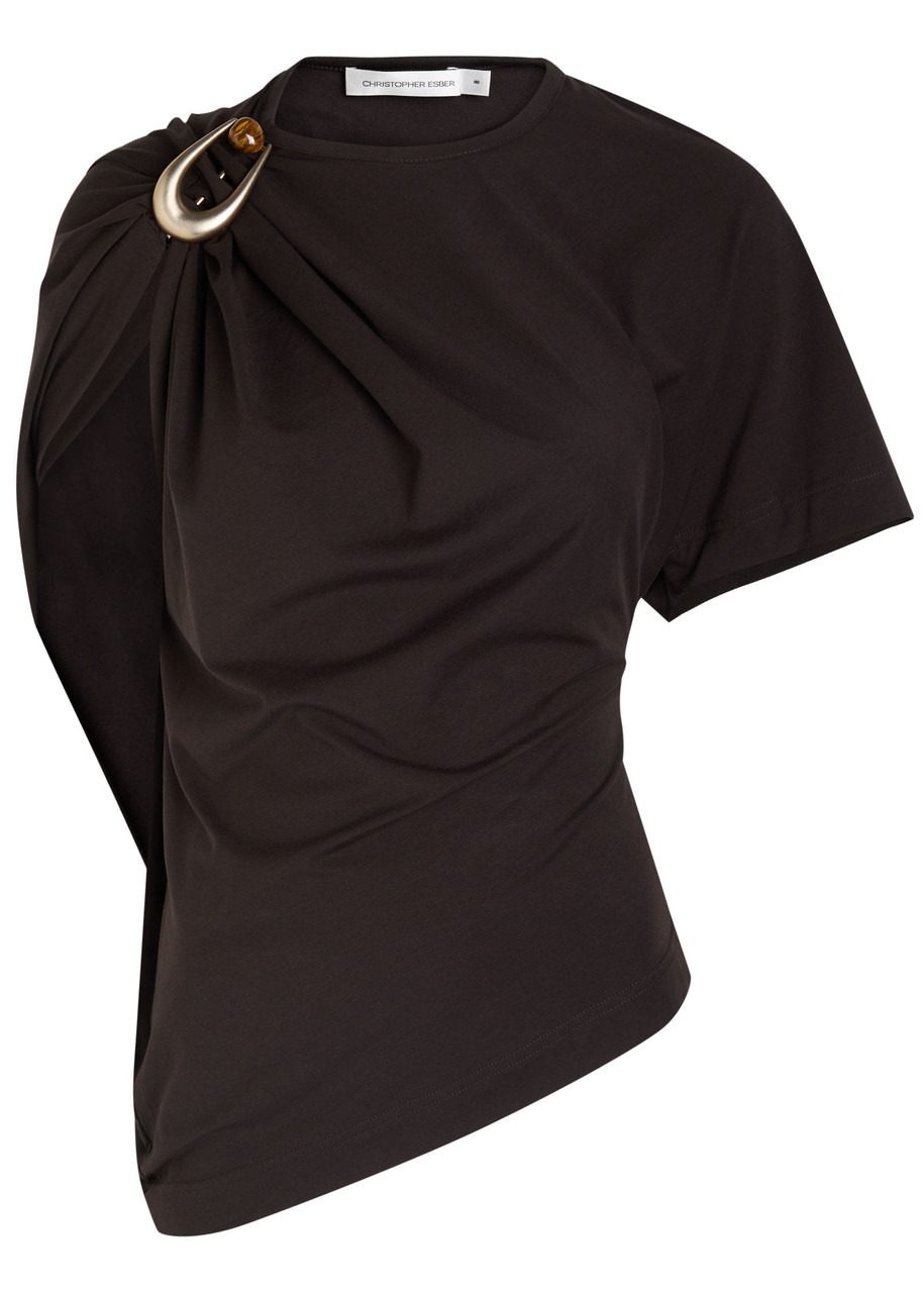Info & Care Christopher Esber stretch-cotton T-shirt Asymmetric design, crew-neck, detachable metal brooch, embroidered eyelets to adjust gathered details; Slips on 93% cotton, 7%;elastane; Hand wash Size & Fit Length shoulder to hem: 1: 29 inches/ 73.5cm; 2: 22 inches/ 56cm Midweight Relaxed fit Model is 5'9"/ 175cm and wears a size;UK8