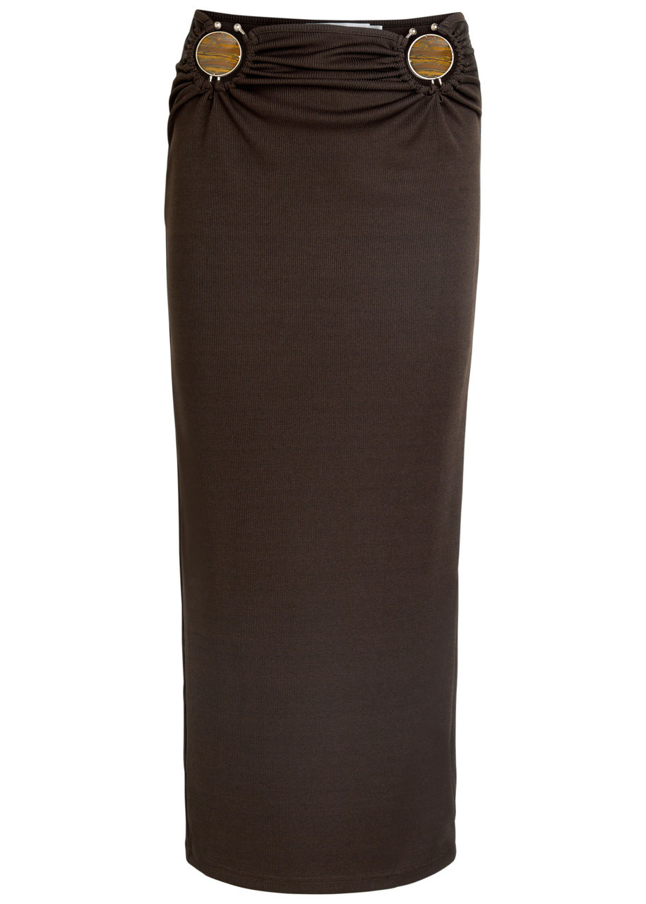 Info & Care Christopher Esber jersey skirt Ribbed, ruched cut-out with structured metal detail Pull on 96% polyester, 4% spandex Dry clean Coordinating items available Size & Fit Length waist to hem: 38 inches/ 96.5cm Midweight Slim fit, straight-cut Model is 5'9"/ 175cm and wears a size;UK8