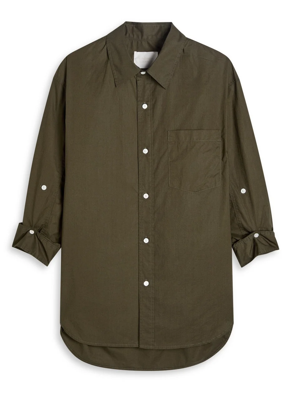Info & Care Citizens of Humanity cotton shirt; Dropped shoulders, gathered button-fastening cuffs, chest patch pocket,;back tab, wide box pleat at back,;side splits at curved hem, longer back hem; Button fastenings through front 100% cotton Machine wash Size & Fit Length shoulder to hem: front: 27 inches/ 68.5cm; back: 32 inches/ 81.5cm Midweight Loose fit Model is 5'10"/ 178cm and wears a size small;