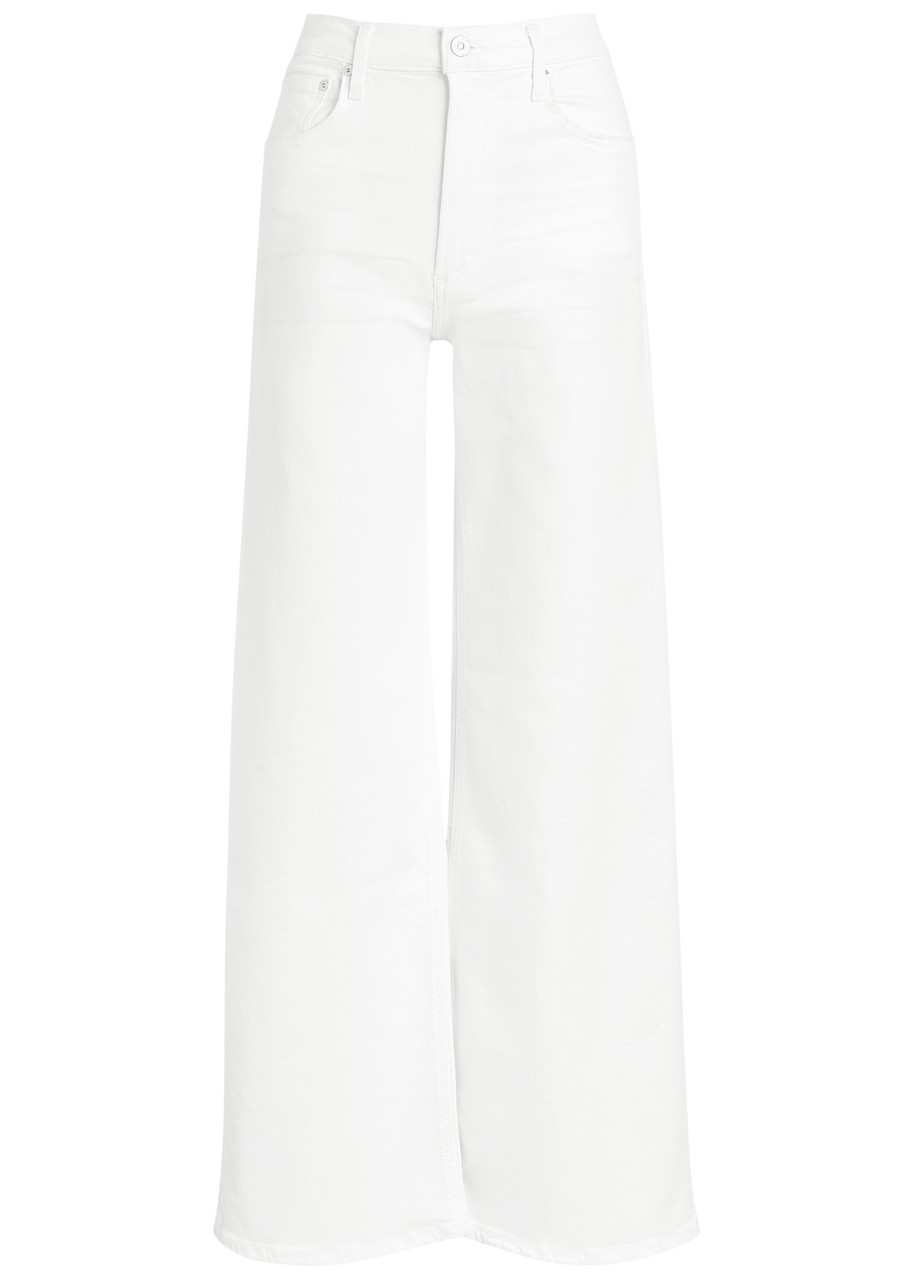 Info & Care Citizens Of Humanity stretch-denim jeans High-rise fit, wide-leg cut, belt loops, five pockets, press-stud embellishments, designer plaque at front and back,;designer-engraved hardware, whiskered Partially concealed button and zip fastening at front Designer wash: Soft White 94% regenerative cotton,;4% polyester,;2% elastane Machine wash cold inside out to avoid colour transfer Size & Fit Front rise: 11 inches/ 28cm Inside leg length: 33 inches/ 84cm Midweight Model is 5'9"/ 175cm and wears a size W27
