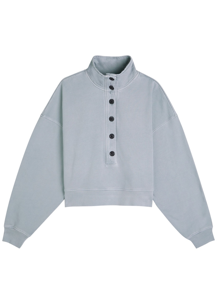 Info & Care Citizens Of Humanity;cotton sweatshirt Pipe-trimmed button-fastening funnel-neck, dropped shoulders,;ribbed trims, slightly faded finish Slips on 100% cotton Machine wash Size & Fit Length shoulder to hem: 21 inches/ 53.5cm Midweight Boxy fit Model is 5'9"/ 175cm and wears a size small;