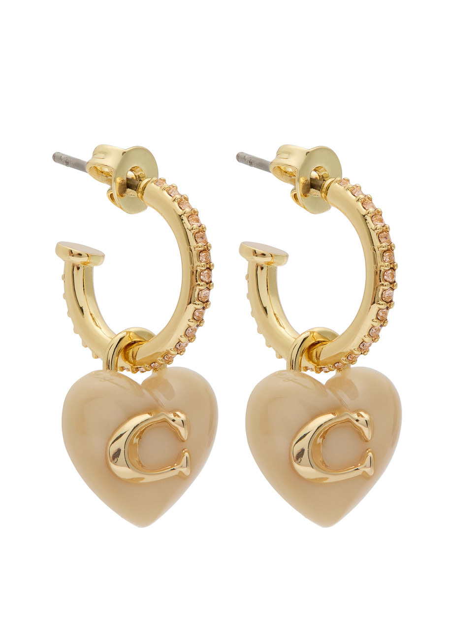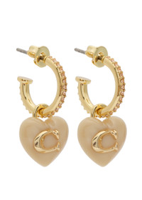 Info & Care Coach metal hoop earrings; Resin heart charms with logo detail, pave crystal embellishments, designer-engraved Butterfly fastening for pierced ears Presented in a designer-stamped box with a pouch Please note, we are unable to refund or exchange for pierced earrings Size & Fit Drop: 2cm