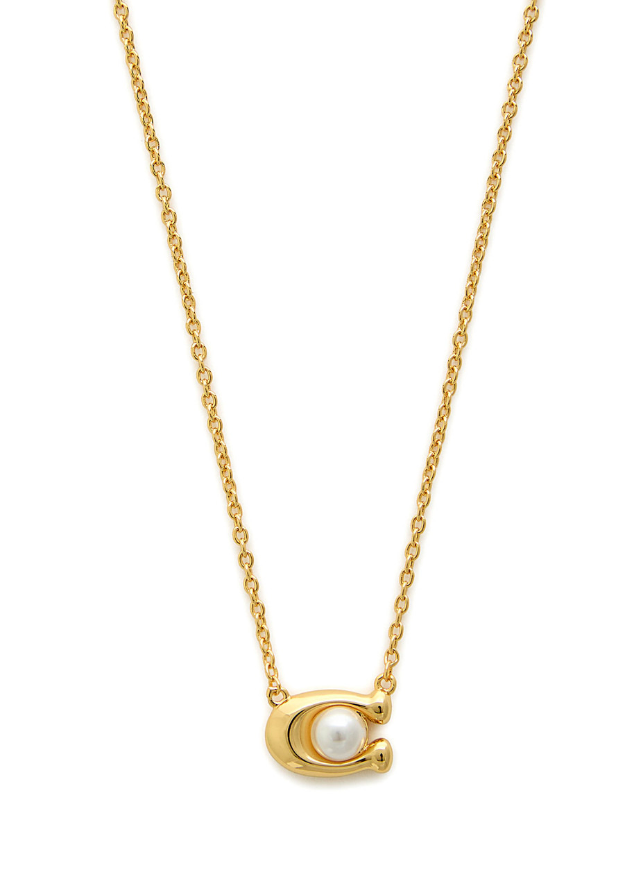 Info & Care Coach metal necklace; Logo plaque pendant, faux pearl embellishment, designer tag with crystal embellishment Adjustable lobster-clasp fastening Presented in a designer-stamped box with a pouch Size & Fit Length: 45cm