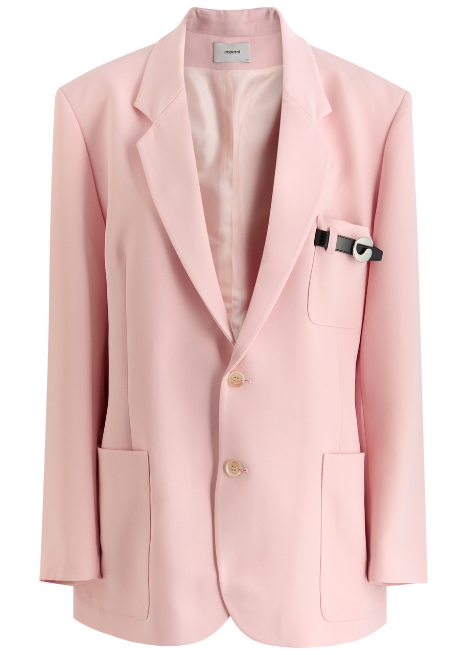 Info & Care Coperni woven blazer Notched lapels, padded shoulders, logo plaque at cuffs, belt loops at chest patch pocket, detachable leather strap with logo plaque, two front patch pockets, back vent, internal slip pocket, fully lined Button fastenings at front 100% wool; lining: 52% acetate, 48% viscose Dry clean Size & Fit Length shoulder to hem: 30 inches/ 76cm Midweight Relaxed;fit Model is 5'11"/ 180cm and wears a size small