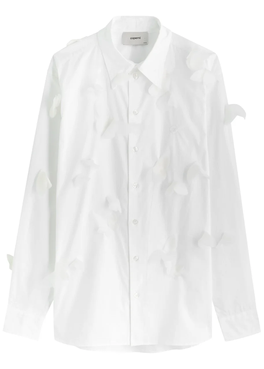 Info & Care Coperni cotton-poplin shirt Organza butterfly applique, dropped shoulders, button-fastening cuffs, embroidered logo at chest,;box pleat at back, side splits at curved hem Button fastenings through front Fabric 1: 100% cotton; fabric 2: 100% organza Machine wash Size & Fit Length shoulder to hem: 26.5 inches/ 67.5cm Midweight Relaxed fit Model is 5'11"/ 180cm and wears a size;FR36