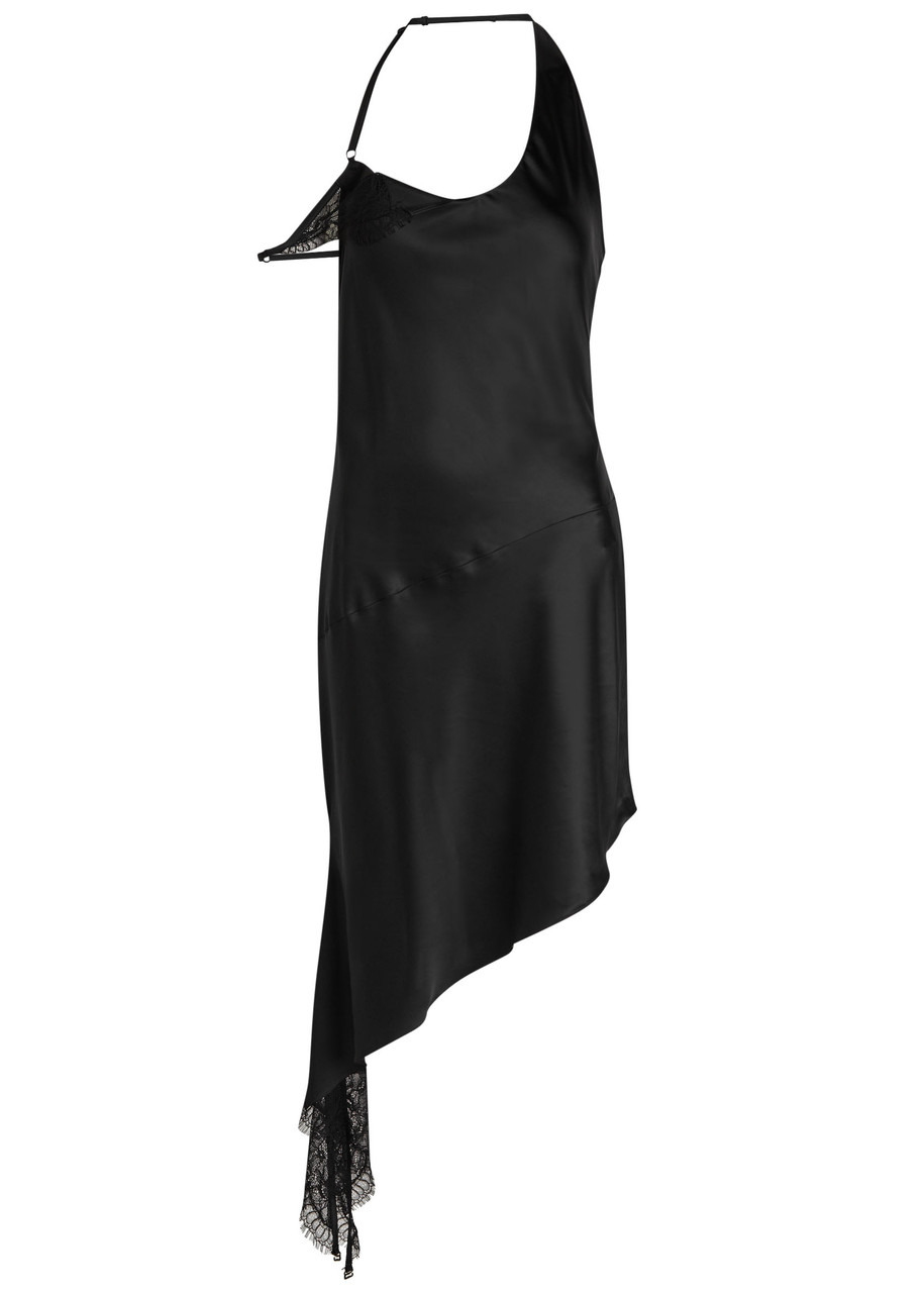 Info & Care Courreges satin dress Scoop-neck, adjustable cross-over shoulder straps, scalloped eyelash lace panels, back vent, garter details at asymmetric back hem Slips on 94% viscose, 6% elastane Dry clean Size & Fit Length shoulder to hem: 1: 36 inches/ 91.5cm; 2: 49 inches/ 124.5cm Midweight Slim fit, loose from the hips Model is 5'9"/ 175cm and wears a size;FR36
