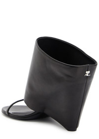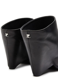 Info & Care Courreges leather mules Wedge heel meausre approximately 3.5 inches/ 90mm Wrap-round panel, designer plaque at heel, open round toe Slip-on Size & Fit Only available in full sizes, go up to the nearest whole size if you take a half size