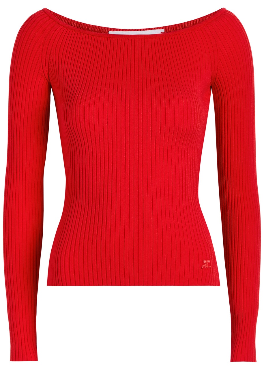 Info & Care Courreges knit;top Ribbed, off-the-shoulder, logo embroidery at hem Slips on 70% viscose, 30% polyester Hand wash; Size & Fit Length shoulder to hem: 19 inches/ 48cm Midweight Regular fit Model is 5'9"/ 175cm and wears a size small