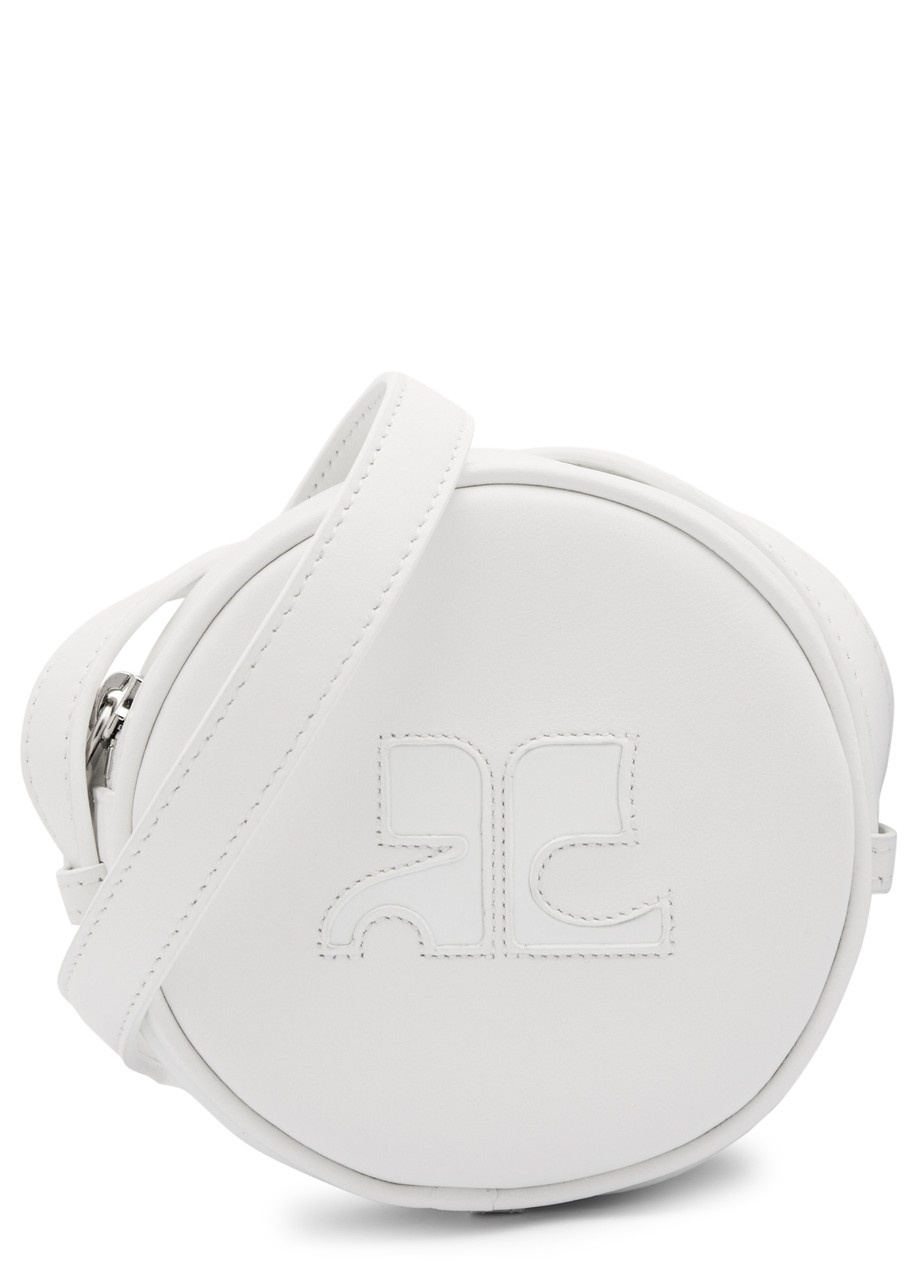 Info & Care Courreges leather cross-body bag; Adjustable shoulder strap, embossed logo, fully lined Zip-fastening across top; Size & Fit Width: 4.5 inches/ 11.5cm Height: 4.5 inches/ 11.5cm Depth: 1.5 inches/ 4cm Min. shoulder strap drop: 16 inches/ 41cm Max. shoulder strap drop: 19.5 inches/ 49.5cm