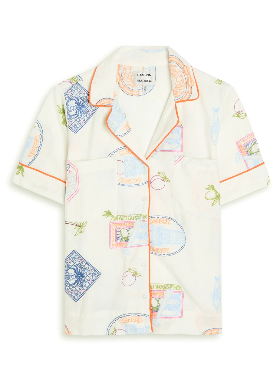 Info & Care Damson Madder cotton-blend shirt Embroidered, camp collar, chest patch pocket, side splits, contrasting piped trims Button fastenings at front 88% cotton, 12% linen Machine wash Size & Fit Length shoulder to hem: 22 inches/ 56cm Midweight Regular, slightly boxy fit Model is 5'9"/ 175cm and wears a size;UK8