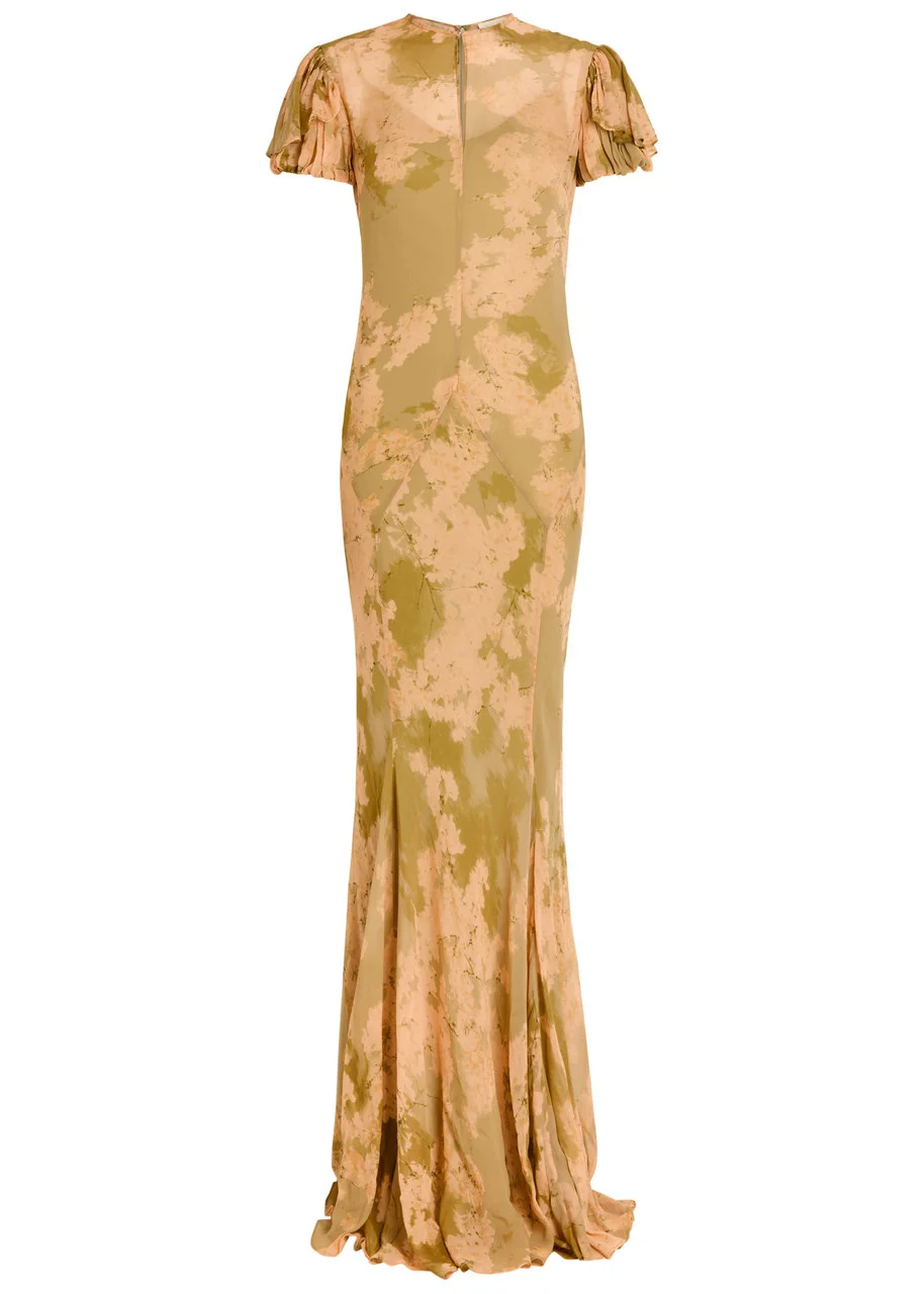Info & Care De La Vali chiffon dress Floral print, hook-fastening round-neck, pleated puffed sleeves with frill overlay, keyhole at bust, bias-cut, slip dress lining Concealed zip fastening at back 100% viscose; slip dress: 94% polyester, 6%;spandex Dry clean Size & Fit Length shoulder to hem: 67 inches/ 170cm Midweight Slim fit, mermaid hem; Model is 5'9"/ 175cm and wears a size UK8