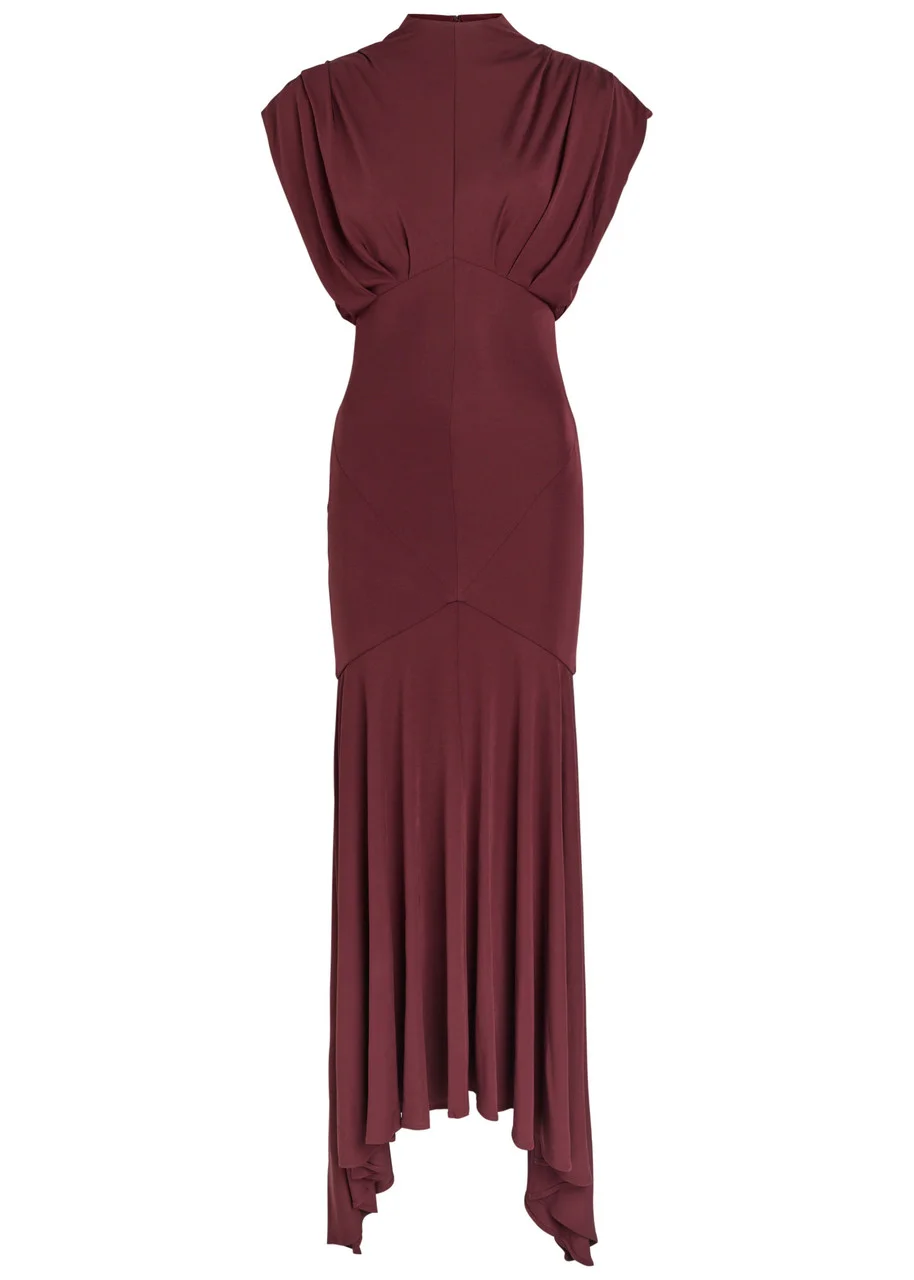 Info & Care De La Vali rayon dress Round-neck, gathered shoulders, cap sleeves, asymmetric hem, partially lined Concealed hook and zip fastening at back; 100% rayon; lining: 85% nylon, 15% elastane Dry clean Size & Fit Length shoulder to hem: 58 inches/ 147cm Midweight Draped bodice, slim across the waist and hips Flared hem Model is 5'10"/ 178cm and wears a size;UK8