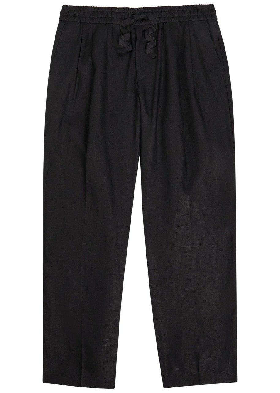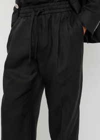 Info & Care Dolce & Gabbana linen;trousers Elasticated drawstring waistband,;zip-fastening fly, pleats at waist, side slant pockets, pressed creases through legs, two;button-fastening pockets at back, logo embroidery at back; Pull on; 100%;linen Dry clean Size & Fit Inside leg length: 31 inches/ 79cm Midweight; Relaxed fit, tapered-leg cut; Model is 6'1"/ 185cm and wears a size IT48;