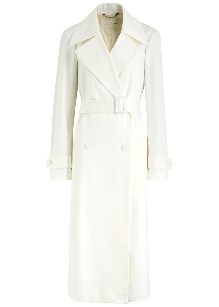 Style Notes Dries Van Noten cotton trench coat Notched lapels with stitching details, padded shoulders, adjustable button-fastening tab at cuffs, panelled through sleeves, detachable belt at waist, side slip pockets, back belt loops, back vent, internal slip pocket, partially lined Double-breasted button fastenings through front 100% cotton Dry clean Info & Care Length shoulder to hem: 49.5 inches/ 126cm Midweight; Loose fit, use belt to cinch the waist; Model is 5'9"/ 175cm and wears a size small;