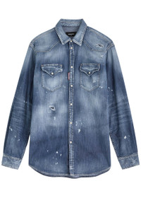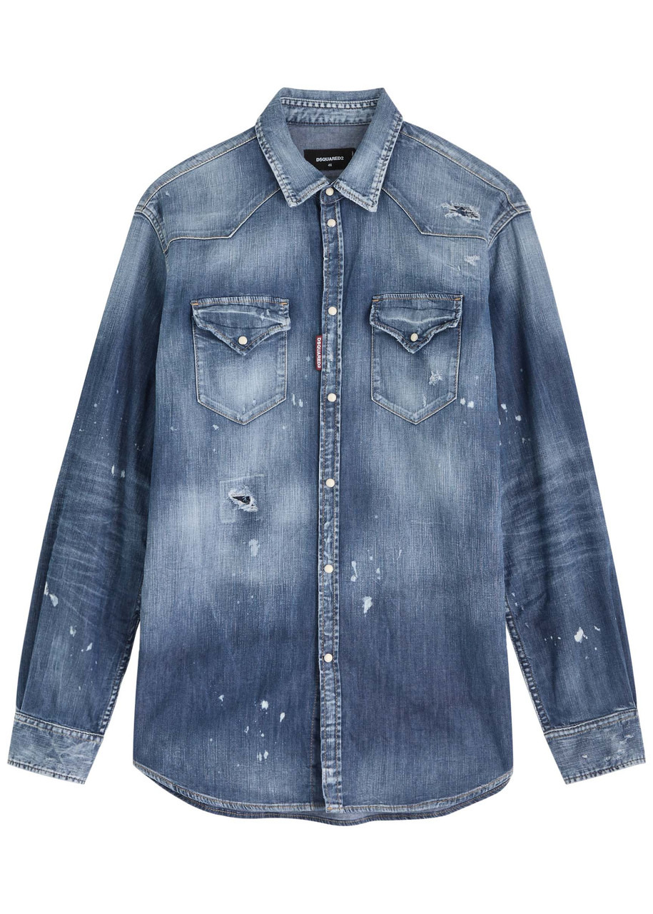 Info & Care Dsquared2 stretch-denim shirt; Paint-splatter effect, press-stud fastening cuffs with gathered details, two press-stud fastening chest pockets, designer tag, curved hem, longer back hem, ripped and distressed details, faded finish; Press-stud fastenings through front; 98% cotton, 2% elastane; Machine wash cold inside out to avoid colour transfer Size & Fit Length shoulder to hem: front: 30 inches/ 76cm; back: 31 inches/ 79cm Midweight; Regular;fit; Model is 6'1"/ 185cm, chest size 38 inches and wears a size IT48