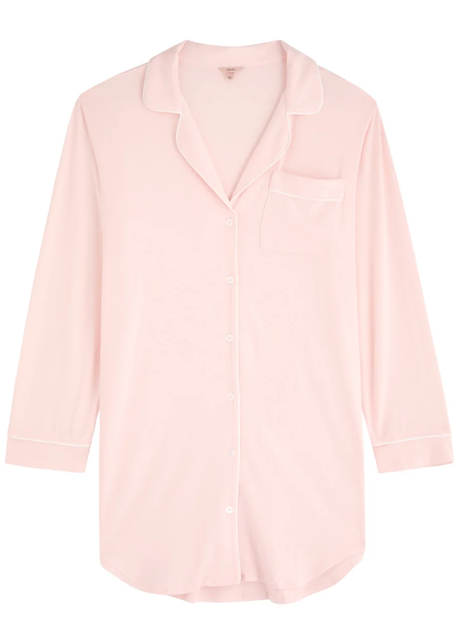 Info & Care Eberjey jersey night shirt dress Camp collar, chest patch pocket, piped trims, curved longer back hem; Button fastenings through front 95% Tencel modal, 5% spandex Machine wash Size & Fit Length shoulder to hem: front: 33 inches/ 84cm; back: 34.5 inches/ 87.5cm Midweight Relaxed fit Model is 5'10"/ 178cm and wears a size small;
