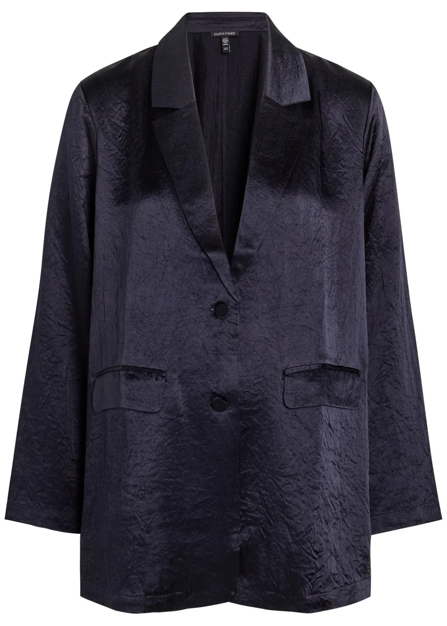 Info & Care Eileen Fisher satin;blazer Notched lapels, front flap pockets, back vent,;crinkled finish Button fastenings at front 100% Naia™ acetate Machine wash Coordinating items available; Size & Fit Length shoulder to hem: 29 inches/ 73.5cm Midweight Loose;fit Model is 5'9"/ 175cm and wears a size small