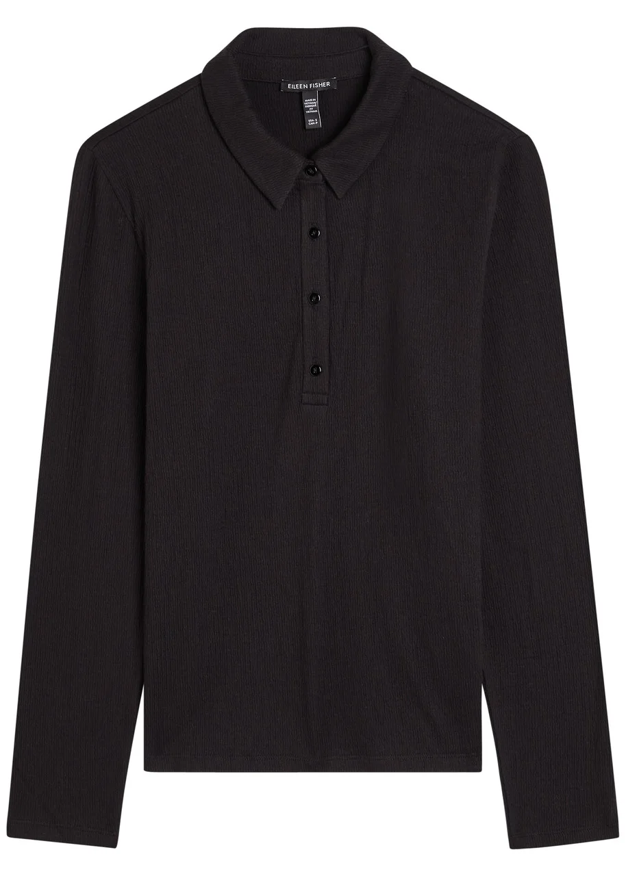 Info & Care Eileen Fisher cotton-blend top Button-fastening neck, side splits, textured finish; Slips on 96% organic cotton, 3% recycled polyester, 1% elastane; Machine wash; Size & Fit Length shoulder to hem: 23 inches/ 59cm Midweight Slim;fit Model is 5'9"/ 175cm and wears a size small
