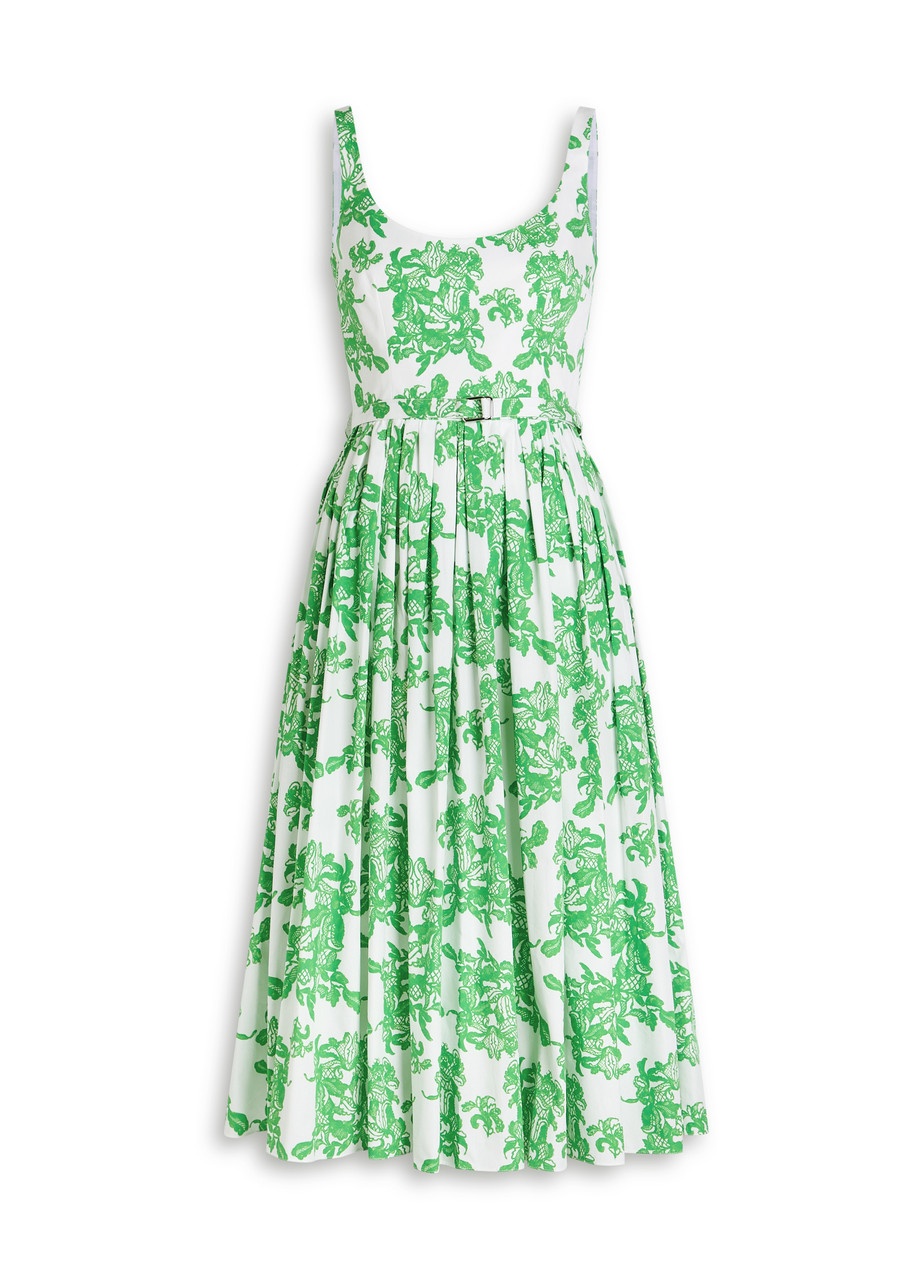 Info & Care Emilia Wickstead cotton poplin dress Printed, scoop-neck, gathered details at waist, belt loops, detachable belt, side slip pockets, fully lined Concealed hook and zip fastening at back 100% cotton Dry clean Size & Fit Length shoulder to hem: 46 inches/ 117cm Midweight Slim across the bust, loose skirt Model is 5'9"/ 175cm and wears a size;UK8