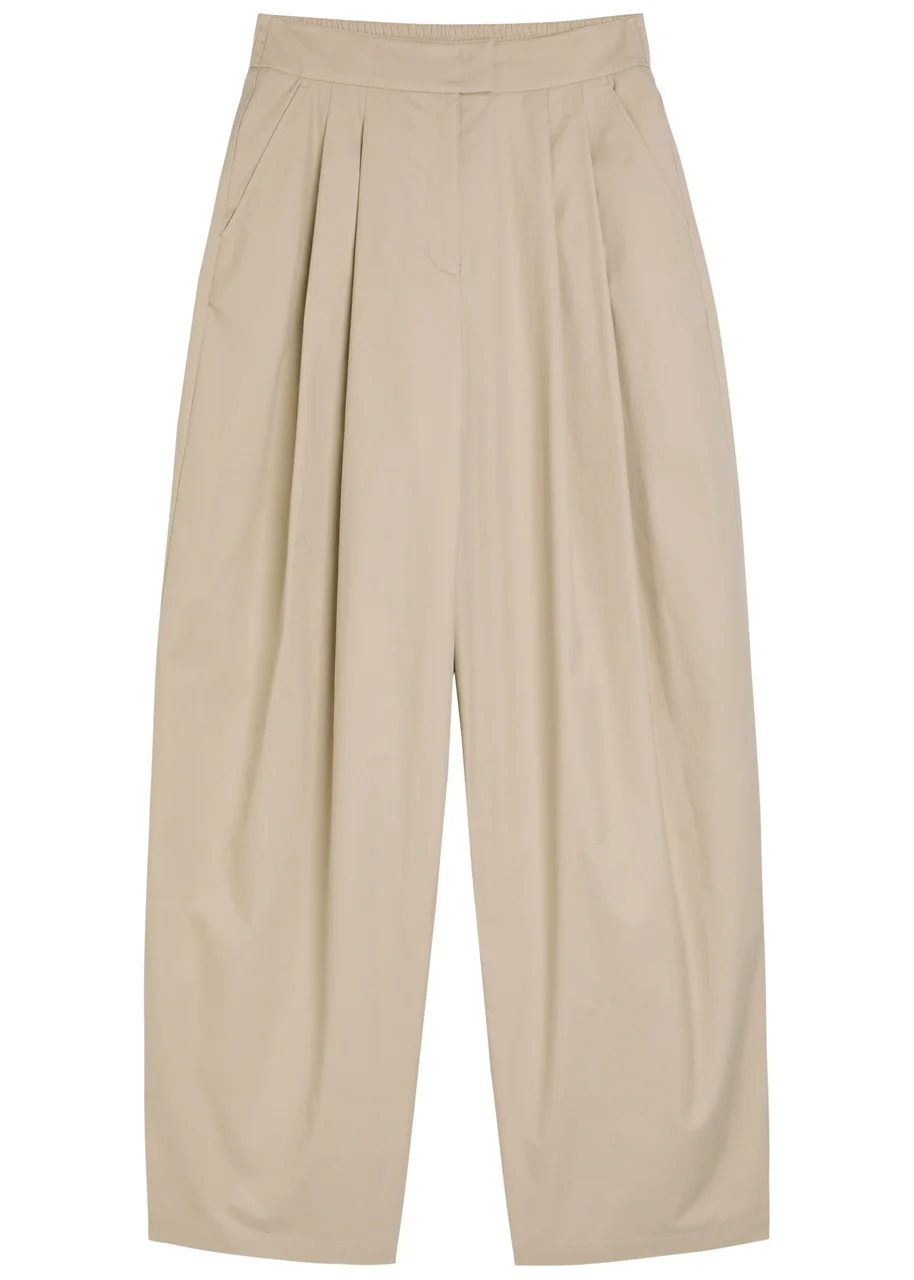 Info & Care Emporio Armani cotton-poplin trousers Partially elasticated waistband, pleats at waist, side slip pockets, back slit pocket,;designer plaque Concealed hook, button and zip fastening at front 100%;cotton Dry clean Size & Fit Inside leg length: 33 inches/ 84.5cm Midweight Wide barrel-leg cut, high-rise fit; Tailored style Model is 5'10"/ 178cm and wears a size;IT40