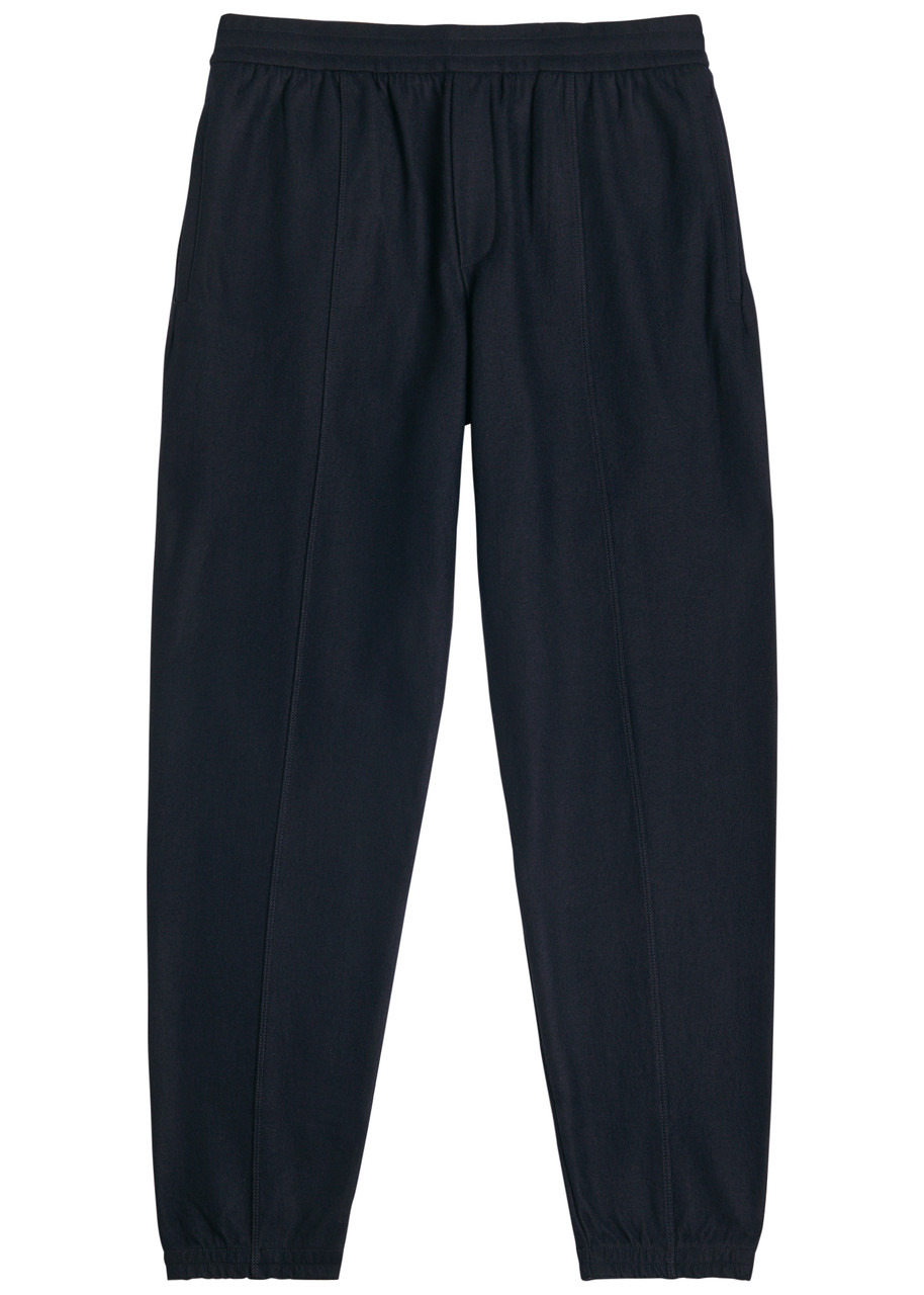 Info & Care Emporio Armani;wool trousers Concealed drawstring at elasticated waistband, faux fly, side slip pockets, seam through legs, designer plaque at back, back slit pockets, elasticated cuffs Pull on 100% virgin wool Dry clean Size & Fit Inside leg length: 30 inches/ 76.5cm Midweight Relaxed, tapered-leg cut Model is 6'1"/ 185cm and wears a size medium