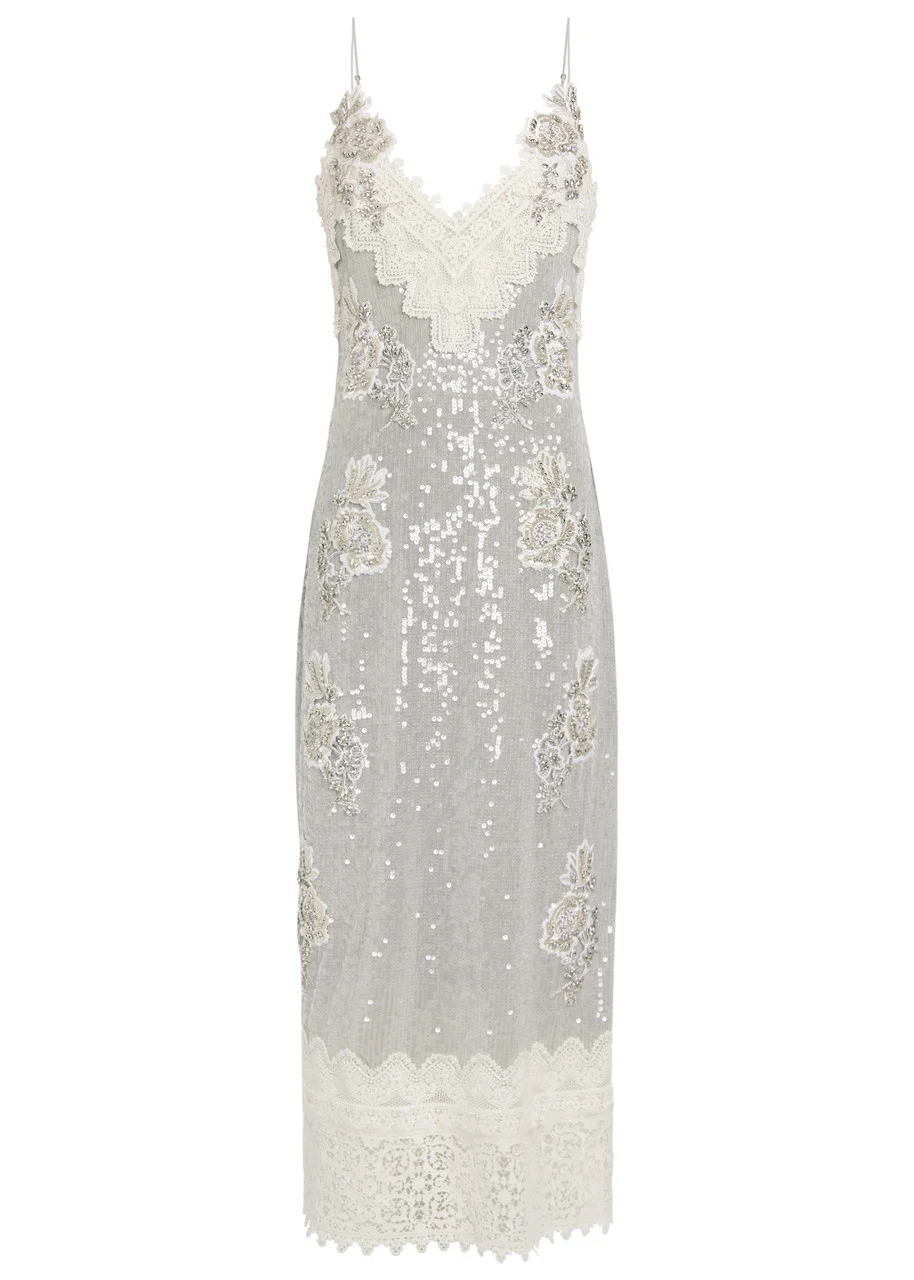Embellished Lace-trimmed Sequined Georgette Midi Dress