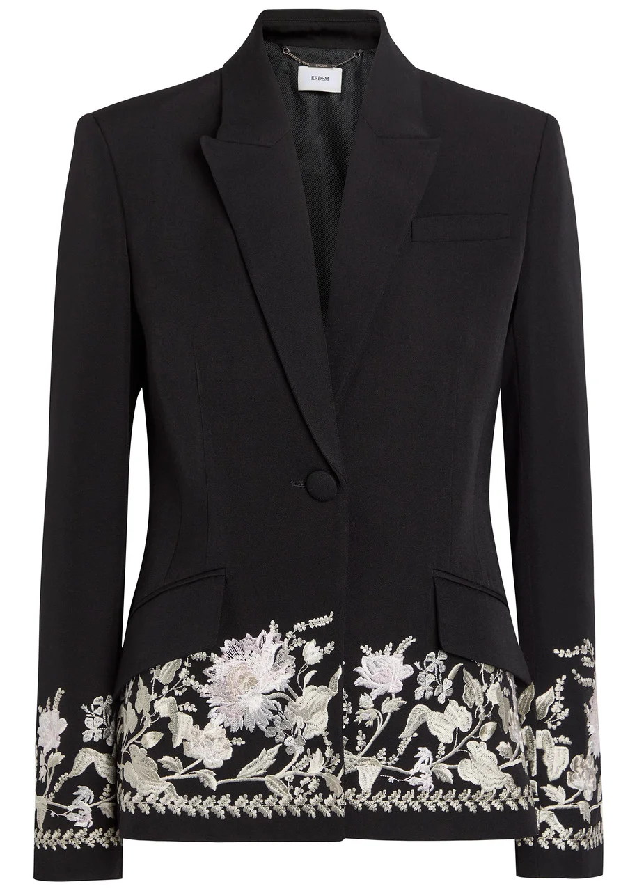 Info & Care Erdem wool blazer Floral embroidery at trims, peaked lapels, padded shoulders, chest slit pocket, darts through waist, front flap pockets, fully lined Button fastening at front 100% virgin wool; lining: 100%;cupro Dry clean Size & Fit Length shoulder to hem: 26 inches/ 66cm Midweight Fitted style, slim across the waist Model is 5'8"/ 173cm and wears a size;UK8