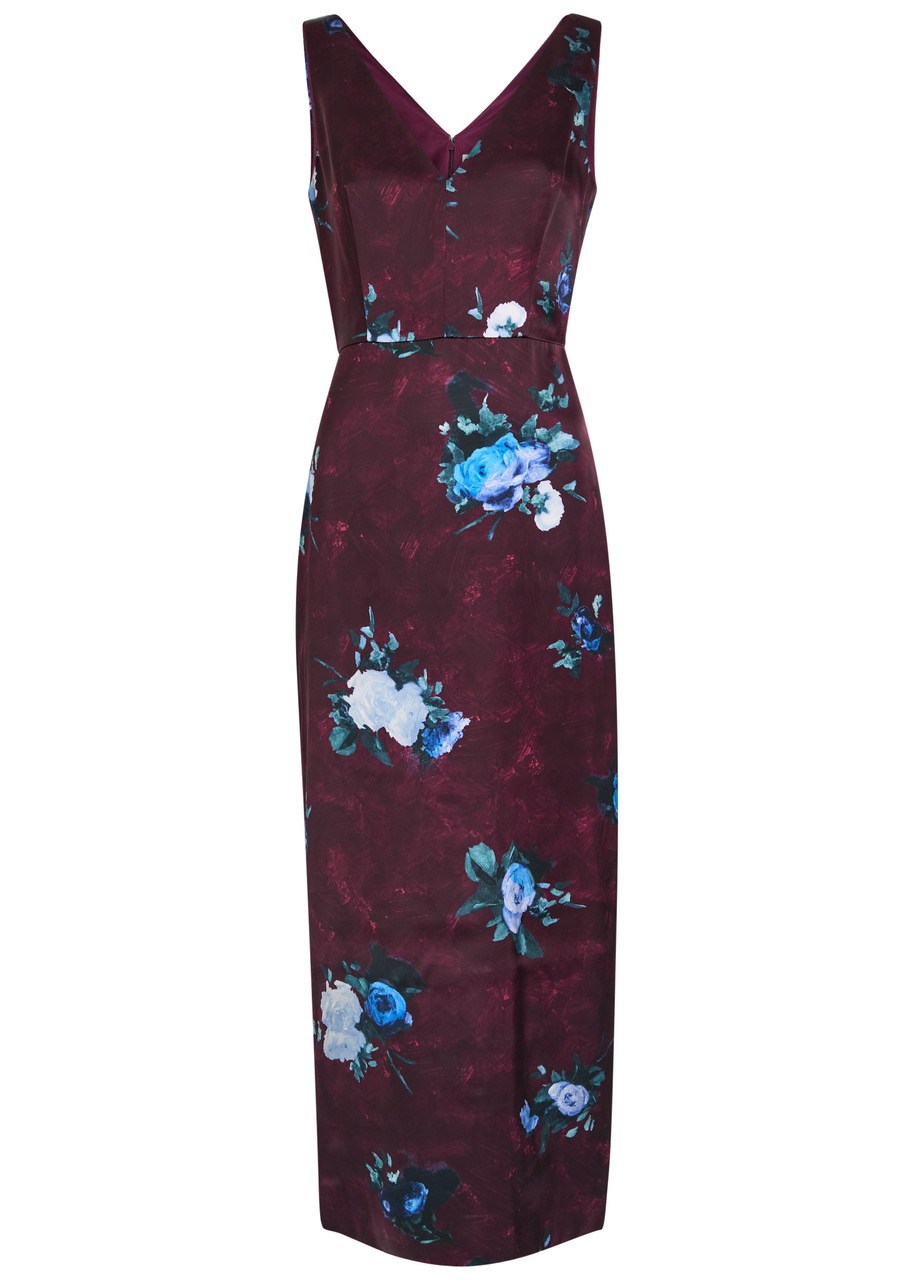 Info & Care Erdem satin dress Floral print, V-neck, back vent, fully lined Concealed hook and zip fastening at back 100% viscose; lining: 100% silk Dry clean Size & Fit Length shoulder to hem: 53 inches/ 134.5cm Midweight Slim fit Model is 5'9"/ 175cm and wears a size;UK8