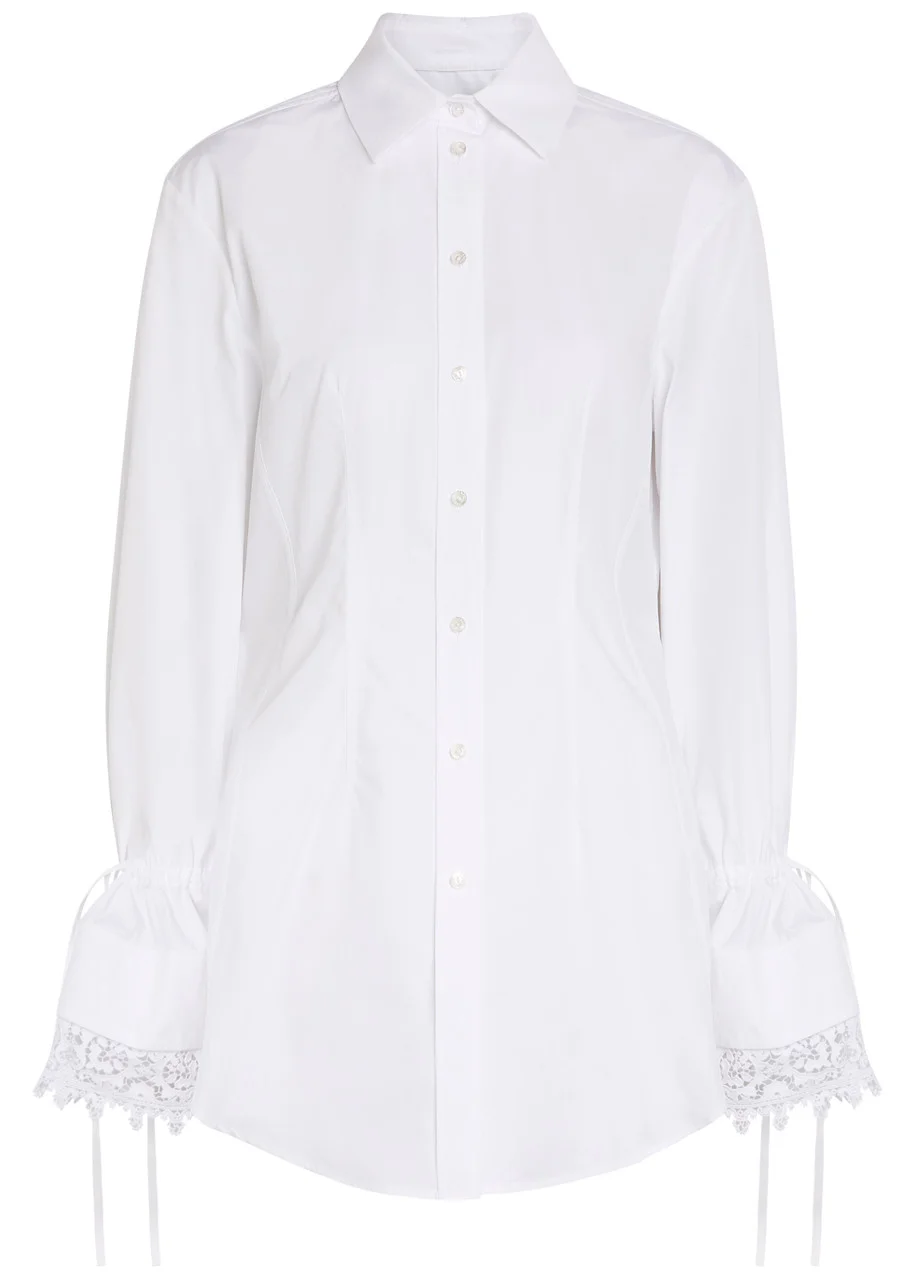Info & Care Erdem cotton-poplin shirt Drawstring and guipure lace trim at button-fastening cuffs, darts through waist, curved hem Button fastenings through front 100% cotton Hand wash; Size & Fit Length shoulder to hem: 30 inches/ 76cm Midweight Fitted, cinched at the waist Model is 5'8"/ 173cm and wears a size;UK8