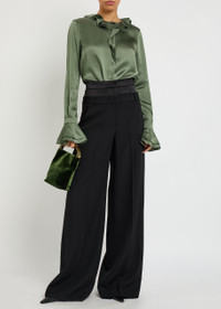 Info & Care Erdem wool trousers Layered silk-blend waist, belt loops, side slip pockets, pressed crease through legs, back slit pockets Concealed button, hook and zip fastening at front Fabric 1: 100% virgin wool; fabric 2: 78% silk, 22% polyester; fabric 3: 100% polyester; lining: 65% polyester, 35% cotton Dry clean Size & Fit Inside leg length: 35.5 inches/ 90cm Midweight High-rise fit, wide-leg cut Model is 5'10"/ 178cm and wears a size;UK8
