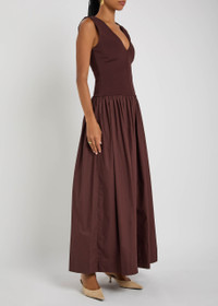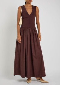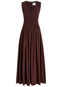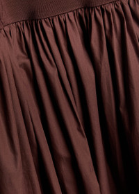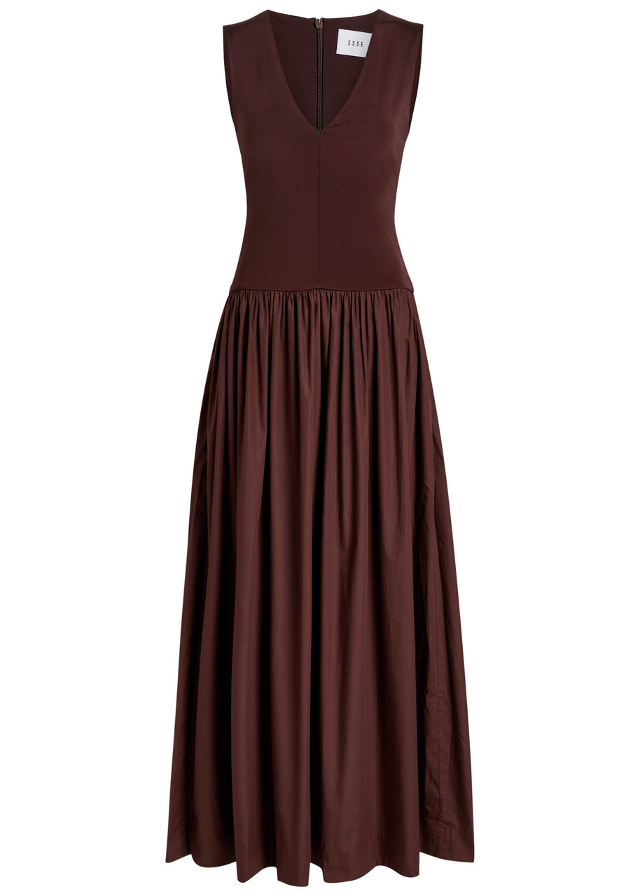 Info & Care Esse Studios cotton dress V-neck,;ribbed jersey bodice, gathered details at waist, side slip pockets, curved hem, partially lined Concealed zip fastening at back Fabric 1: 100% organic cotton; fabric 2: 66% viscose, 27% nylon, 7% elastane Dry clean Size & Fit Length shoulder to hem:;57 inches/ 145cm Midweight Slim;bodice, loose from waist Model is 5'10"/ 178cm and wears a size UK8
