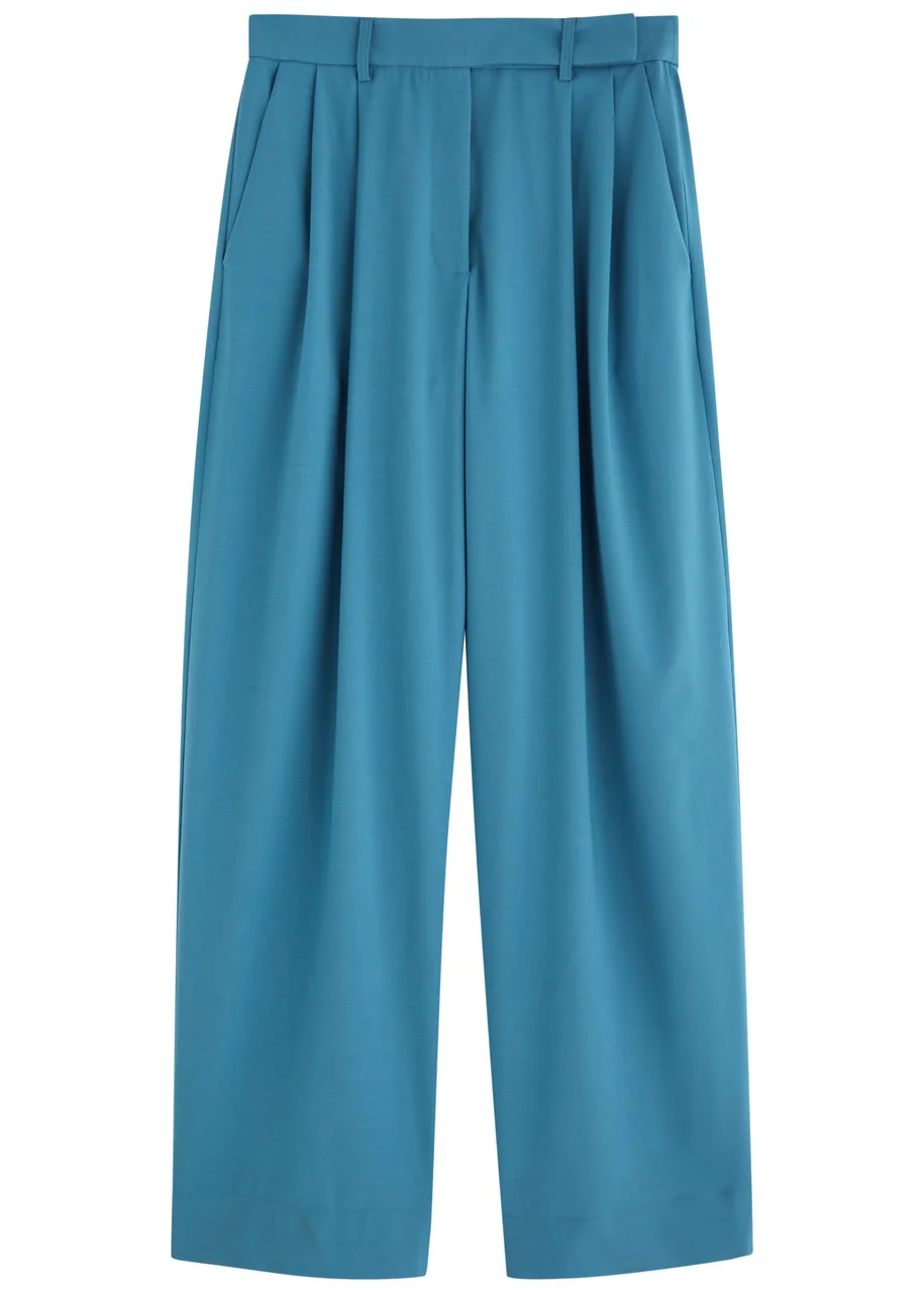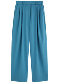 Info & Care Esse Studios woven trousers Belt loops, pleats at waist, side slip pockets, two back slit pockets Concealed zip, hook and button fastenings at front 53% polyester, 43% virgin wool, 4% elastane Dry clean Size & Fit Inside leg length: 32.5 inches/ 83cm Midweight Wide-leg cut Model is 5'9"/ 175cm and wears a size UK8