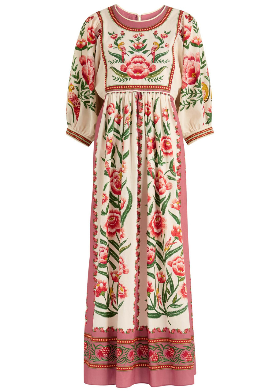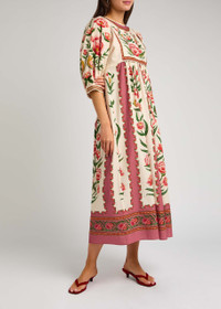 Info & Care Farm Rio poplin dress Printed, round neck, balloon sleeves, gathered under bust, beaded button fastenings at back Concealed zip fastening at side; 65% Lyocell, 35% cotton Machine wash; Size & Fit Length shoulder to hem: 53.5 inches/ 136cm Midweight; Slim bodice, loose skirt; Model is 5'9"/ 175cm and wears a size small;