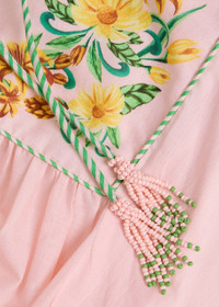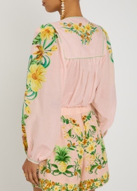 Info & Care Farm Rio cotton blouse Floral print, bead-embellished tie fastening at round-neck, raglan sleeves, ruched lining at shoulders, button-fastening cuffs, elasticated hem, gathered details, piped trims, partially lined Slips on 100% cotton Machine wash Co-ordinating item available; Size & Fit Length shoulder to hem: 17 inches/ 43cm Midweight Relaxed, cropped fit Model is 5'10"/ 178cm and wears a size small
