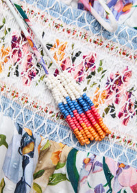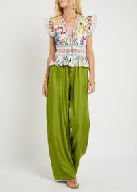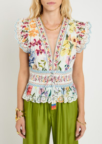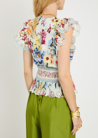 Info & Care Farm Rio;cotton blouse Floral print, hook-fastening;V-neck, pleated details, drawstring at smocked waistband, embroidered details, peplum hem,;open embroidery at scalloped trims Slips on 100% cotton Machine wash Size & Fit Length shoulder to hem: 21 inches/ 53.5cm Midweight Fit-and-flare style, use drawstring to cinch waist Model is 5'9"/ 175cm and wears a size small;;