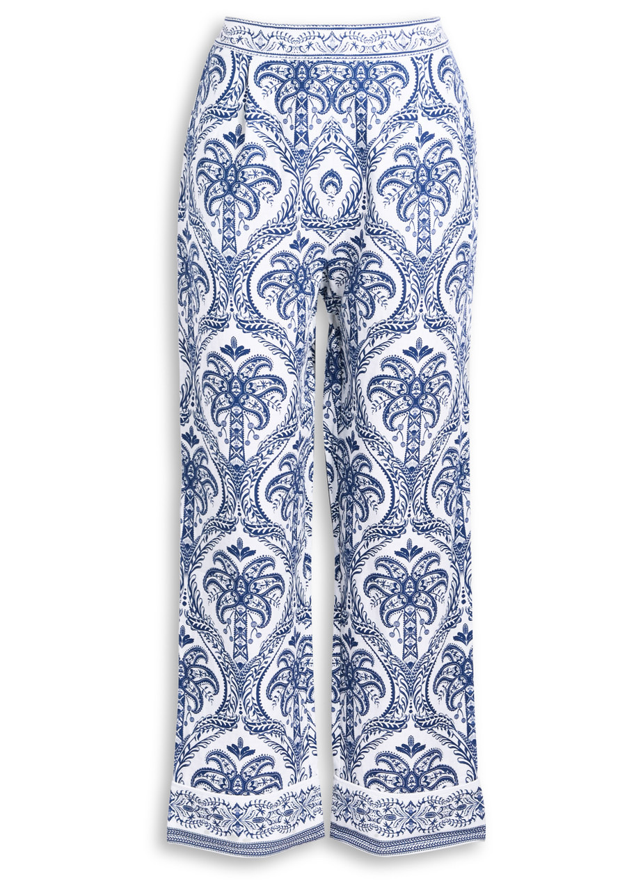 Info & Care Farm Rio linen-blend;trousers Printed, partially elasticated waistband, pleats at waist, two concealed side slip pockets, pipe-trimmed turn-up cuffs Concealed hook and zip fastening at side 55% linen, 45% viscose Machine wash Coordinating items available Size & Fit Inside leg length: 29.5 inches/ 75cm Midweight Straight-leg cut Model is 5'9"/ 175cm and wears a size small;