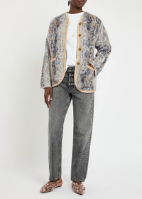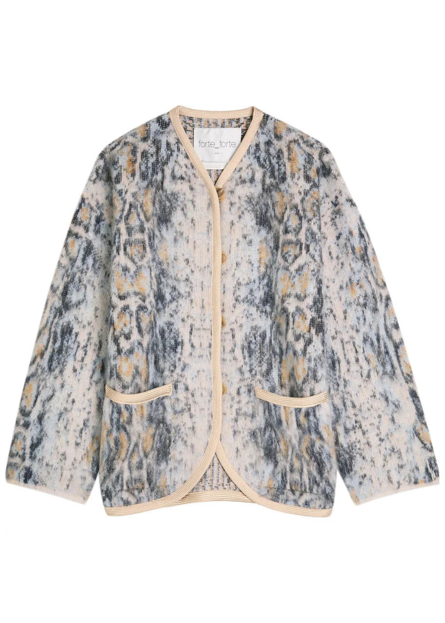 Info & Care forte_forte;knit jacket Python-effect jacquard, V-neck, dropped shoulders, front slit pockets, braided trims, notched front hem, brushed finish Button fastenings through front 40% alpaca 32% polyamide 18% wool 10% mohair Dry clean Size & Fit Length shoulder to hem: 26 inches/ 66cm Midweight Designed to be worn oversized, cut for relaxed fit Model is 5'9"/ 175cm and wears a size;1