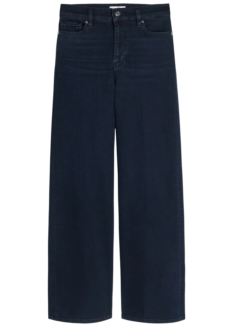 Info & Care Frame stretch-denim jeans High-rise fit, wide-leg cut, belt loops, five pockets,;whiskered finish Partially concealed zip and button fastening at front 70% cotton, 17% polyester, 11% lyocell, 2% elastane Machine wash cold inside out to avoid colour transfer Size & Fit Front rise: 10 inches/ 25.5cm Inside leg length: 31 inches/ 79cm Midweight Model is 5'10"/ 178cm and wears a size;W27