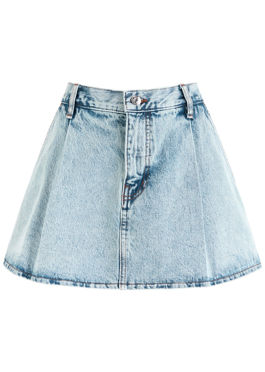 Info & Care Frame denim skirt Belt loops, two slip pockets, contrast stitching, designer engraved hardware, pleated front, two back patch pockets, bleached finish; Partially concealed button and zip fastenings at front; 100% regenerative cotton; Machine wash cold inside out to avoid colour transfer Size & Fit Length waist to hem: 13 inches/ 33cm Midweight; Regular fit, flared style;; Model is 5'8"/ 172cm and wears a size W27 Please note, this style is particularly short in length