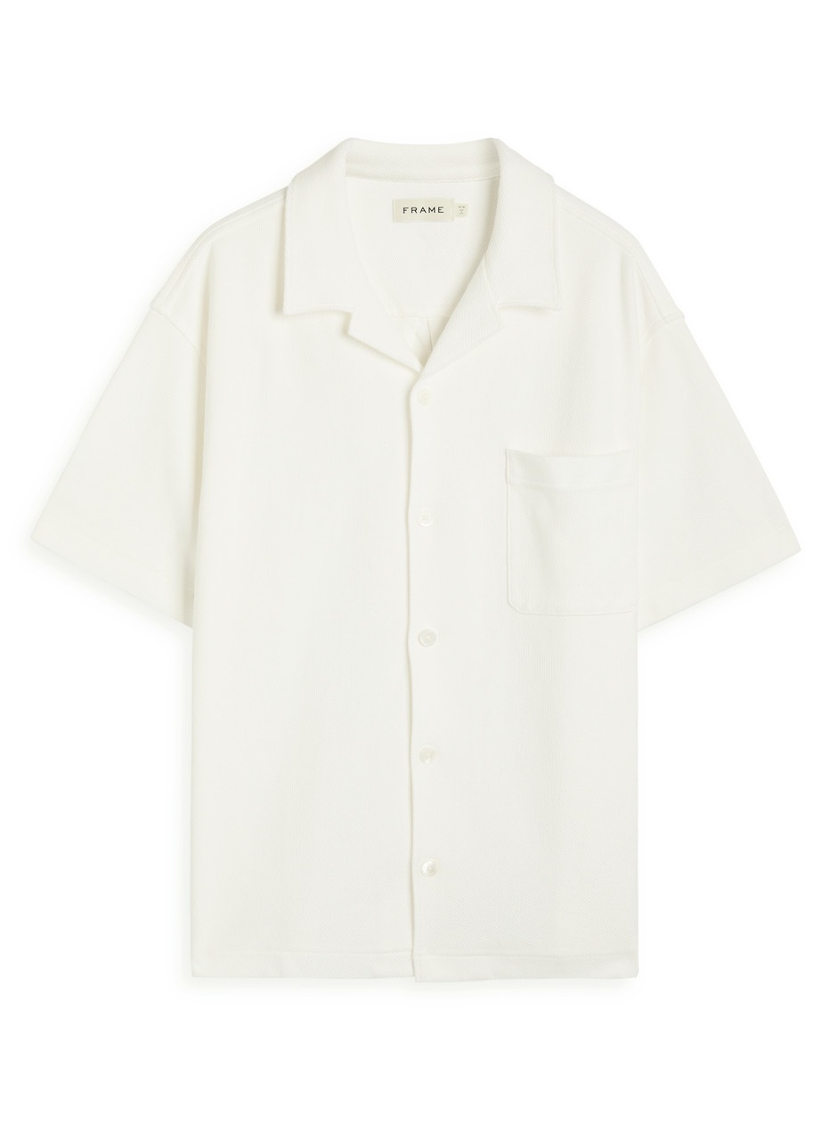 Info & Care Frame cotton;shirt Textured jacquard, camp collar, chest patch pocket, side splits at hem, box pleat at back Button fastenings through front 100% cotton Machine wash Size & Fit Length shoulder to hem: 25.5 inches/ 65cm Midweight Relaxed fit, boxy style; Model is 6'1"/ 185cm, chest size 38 inches and wears a size medium