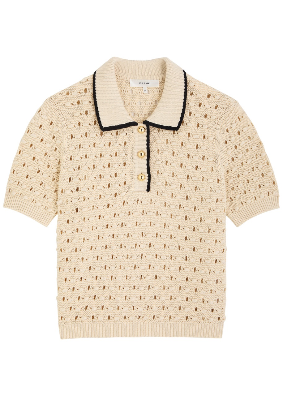 Info & Care Frame open-knit polo shirt Knit bobble details, contrasting stripe at button-fastening neck and collar, ribbed trims Slips on; 100% cotton Dry clean Size & Fit Length shoulder to hem: 19.5 inches/ 49.5cm Midweight Regular, boxy fit Model is 5'10"/ 178cm and wears a size small;