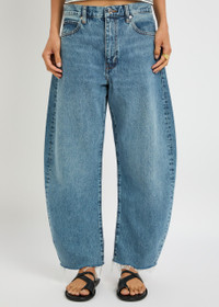 Info & Care Frame denim jeans Mid-rise fit, barrel-leg cut, belt loops, five pockets, designer-engraved hardware, distressed;cuffs, faded finish Partially concealed zip and button fastenings at front Designer wash:;Knock Out Raw Fray 100% regenerative cotton Machine wash cold inside out to avoid colour transfer Size & Fit Front rise: 12 inches/ 30.5cm; Inside leg length: 26.5 inches/ 67.5cm Midweight Model is 5'10"/ 178cm and wears a size;W27