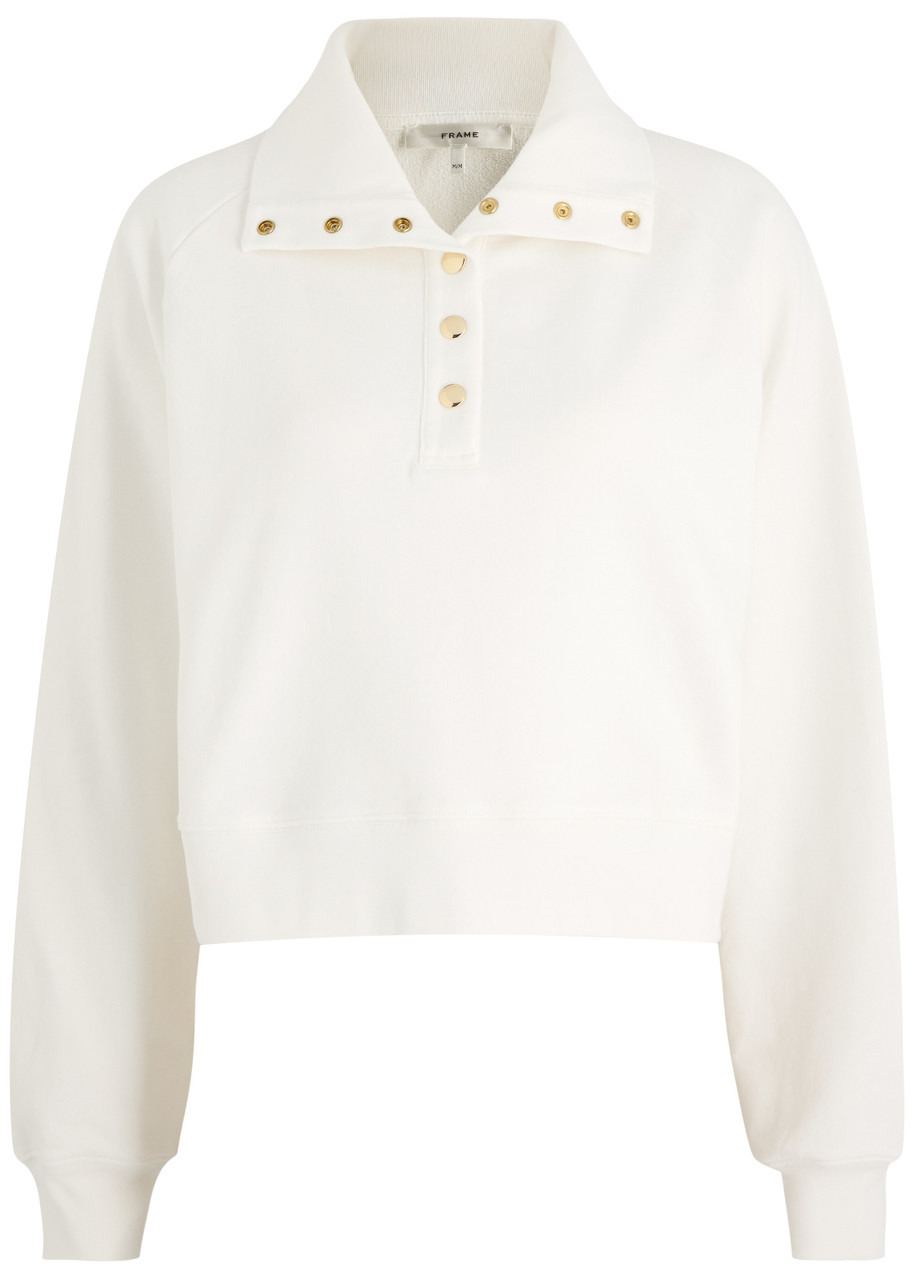 Info & Care Frame cotton sweatshirt Button-fastening high-neck, raglan sleeves, ribbed trims; Slips on 100% cotton Machine wash Size & Fit Length shoulder to hem: 19 inches/ 48cm Midweight Regular fit Model is 5'10"/ 178cm and wears a size small