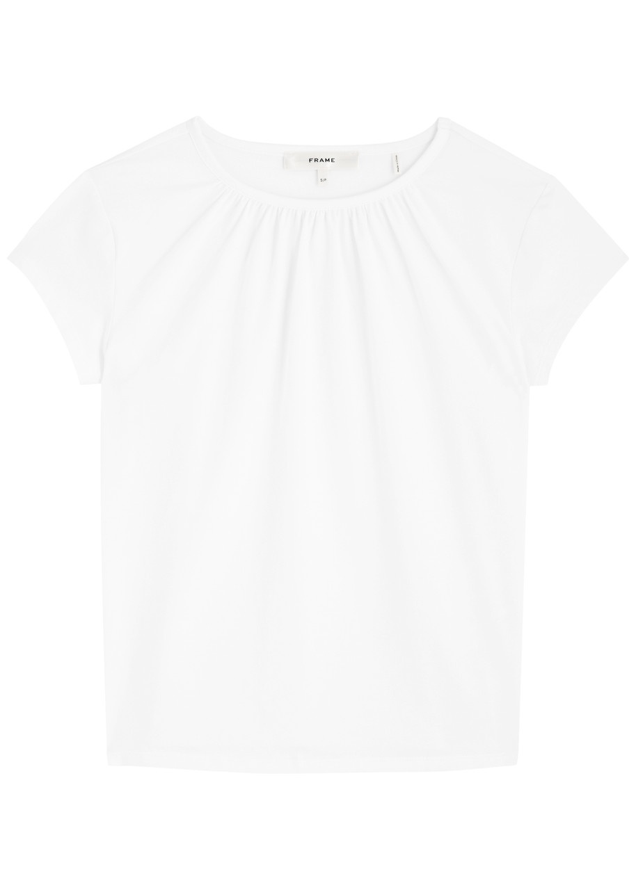 Info & Care Frame stretch-cotton T-shirt Gathered details at crew-neck, cap sleeves Slips on 93% cotton, 7% spandex Machine wash Size & Fit Length shoulder to hem: 19.5 inches/ 49.5cm Midweight Regular fit Model is 5'10"/ 178cm and wears a size small;